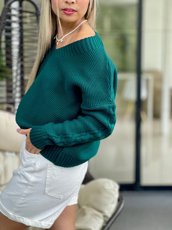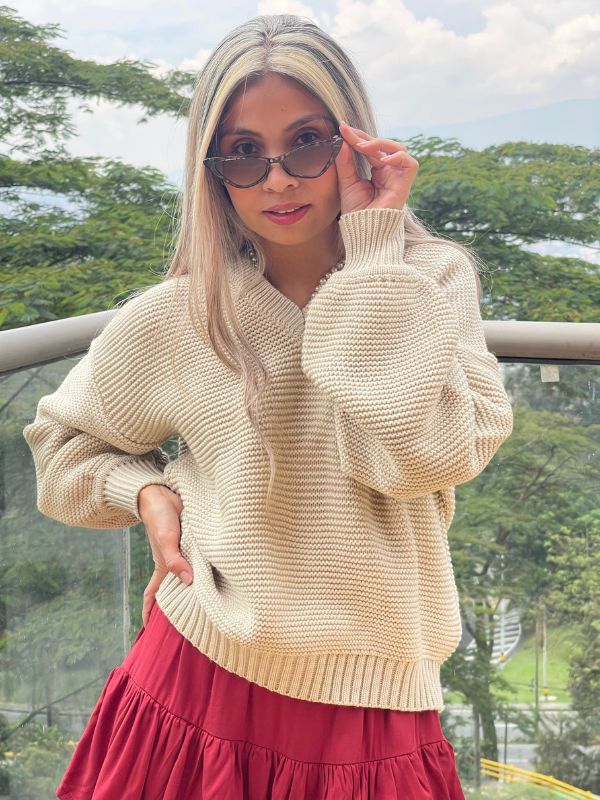 Buzo tejido cuello V con detalle en las mangas.