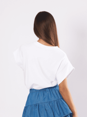 Chaqueta de jean, bolsillos y botones en la parte delantera, decorado con flecos parte posterior.