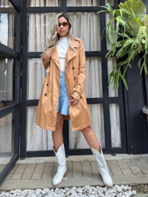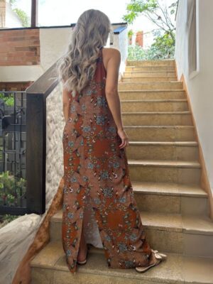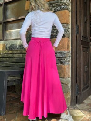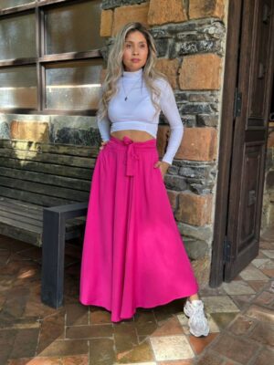 Falda larga estampada, terminación en pico, amarre en cintura y bolsillos laterales. 100% viscosa.